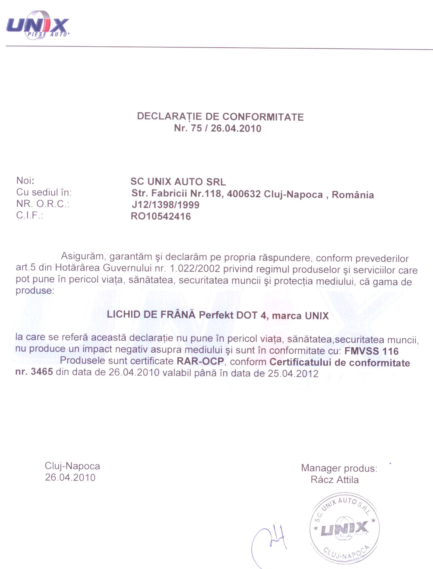 Lichid de frână UNIX1 elementDeclaraţie de conformitate lichid de frână UNIX